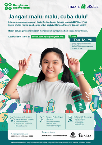 23 Jun 2022 | Aktiviti TerkiniHai semua. Pertandingan HIP StoryFest telah kembali buat kali ke-4 tahun ini. Kali ini kami ada satu berita menarik! Sepanjang Julai dan Ogos, satu siri bengkel LIVE percuma akan kami bawakan kepada adik adik, yang dianjurkan khas sempena Pertandingan Bahasa Inggeris HIP StoryFest Maxis eKelas. Anda akan berpeluang untuk belajar daripada mereka yang mahir dalam bidang penceritaan - pelakon berbakat dan guru terkemuka - tentang bagaimana cara meningkatkan kemahiran komunikasi secara menyeronokkan dan interaktif. Sama ada adik-adik suka menulis, bercakap atau berlakon, adik-adik akan dapat mempelajari sesuatu yang baharu tentang penceritaan dan diri adik-adik sendiri dalam sesi ini.